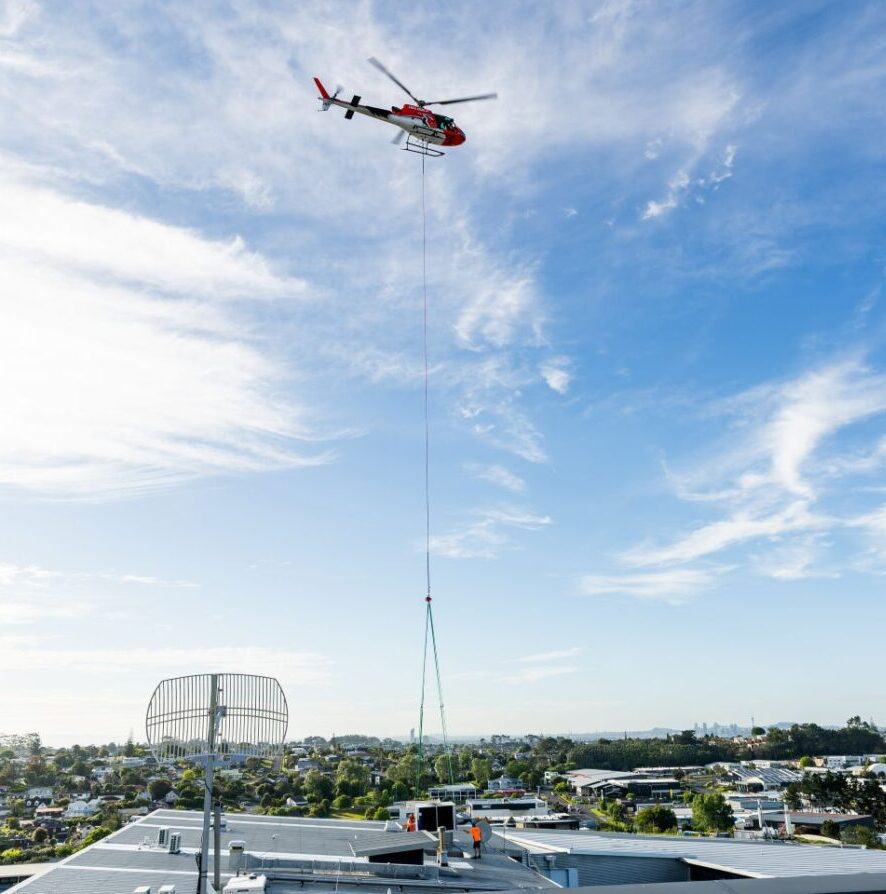 On the day, the helicopter lifts were carried out with precision. The old, heavy compressors were removed in one lift, and the new chiller was lifted and guided through the plantroom roof before being placed onto a pre-built custom Monkeytoe platform. The roof structures were reinstated, new polyethylene pipework installed, and the system fully commissioned.